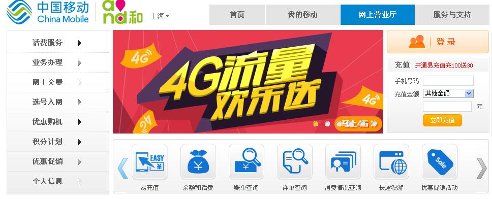 上海移动网上营业厅http://www.sh.10086.cn/sh/service/中国移动网上营业厅http://www.10086.cn/上海移动网上营业厅,是上海移动通信提供给客户进行业务受理、营销推广、信息查询的网上自助的服务营销平台。网上营业厅为全球通、动感地带、神州行、集团客户4大客户提供优质服务。