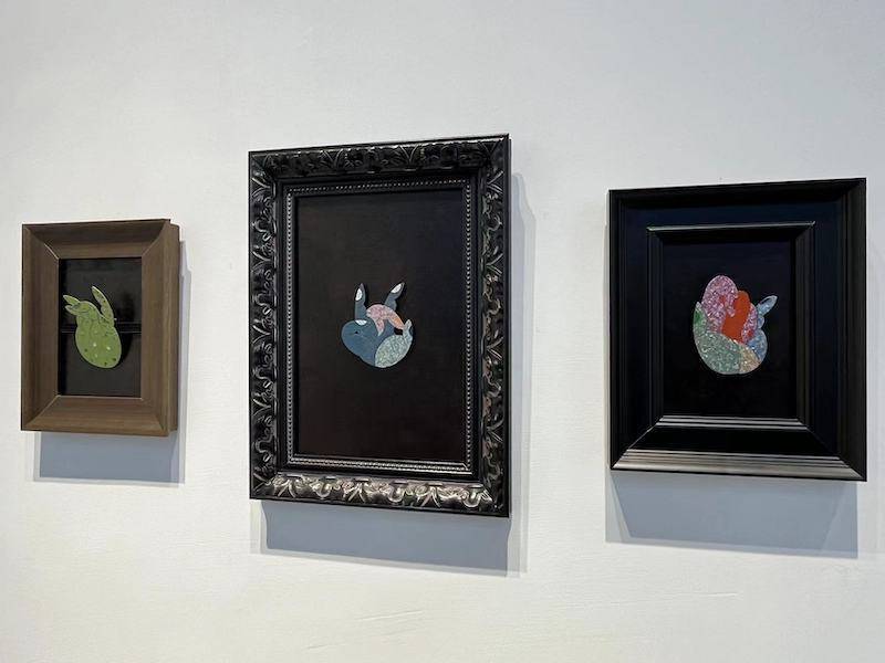 进入展厅,可以看到艺术家刘春寒的《风筝花朵》,该作品展示了与潍坊风筝非遗工作坊合作的成果,通过特别烤制的竹艺骨架和精确裱糊工艺,将传统风筝制作与花朵植物造型相结合,呈现出新颖的传统工艺形式。艺术家周逸乔的系列作品中的《兰花指I之一/二/三》,其利用大漆等材料勾勒兰花指的形象,展现了极具工艺特色的表现手法,将蛋壳、螺钿等传统工艺材料与新工艺材料相结合,创造出不同手指形态。
