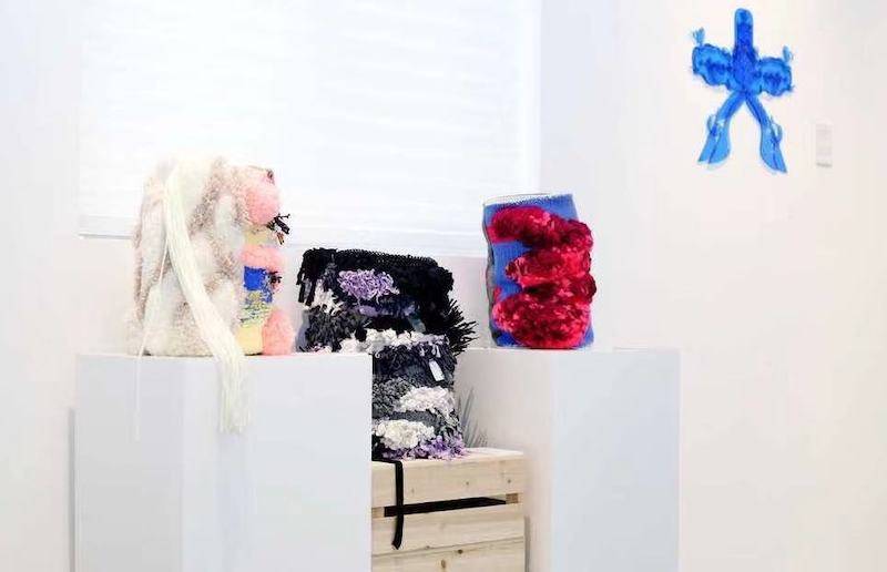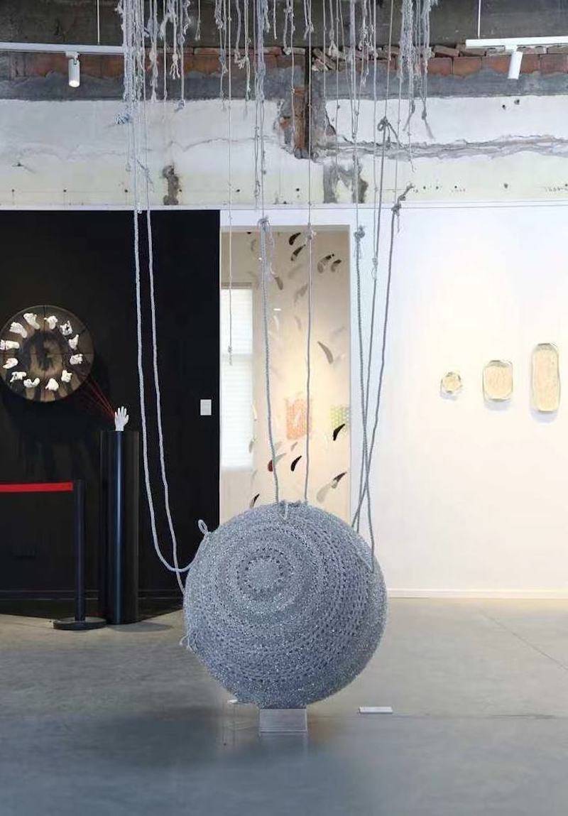 编织,既是古老的手工技艺,也是现如今的当代艺术家所喜爱运用的技巧。策展人周悦就是一位纤维艺术家,她的作品《庆典》从古代中国天圆地方的宇宙观和以明月代替相思的诗词中汲取灵感,创作出带有奇幻色彩的编织作品。而艺术家虞师菁的《SOFT VASE》系列则是通过回收服装辅料创作而成。