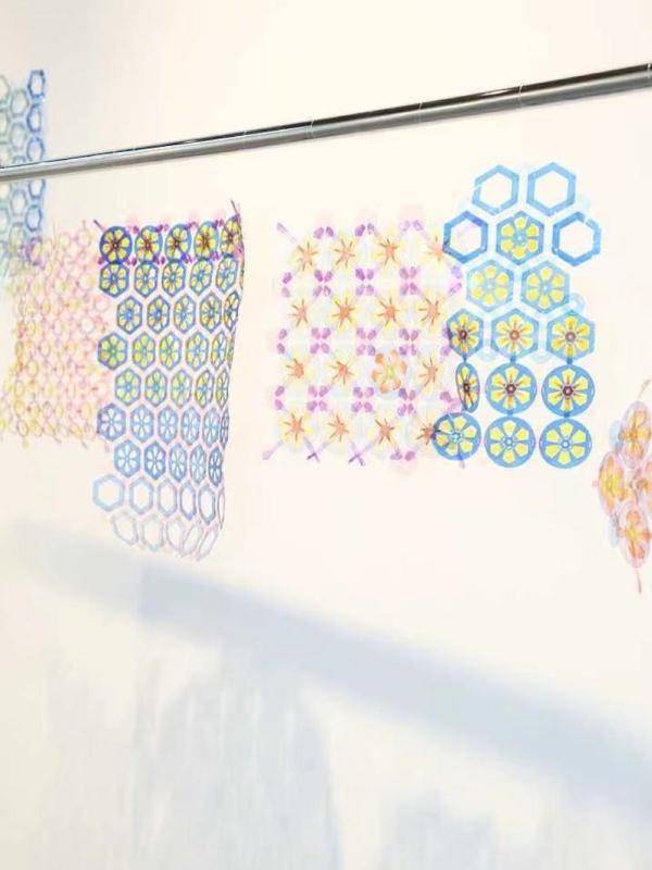 在对于传统图案的运用中,王金妹的《Interlock》以自然植物图案为灵感,通过手工染色的方式探索色彩与图案的构成美感。吴汶倩的立体剪纸作品《茧园:双生相》探讨了亲密关系中共生与献祭的关系。而陶梓萌创作的装置作品《柿影叠花》,则重新演绎了祥物文化。