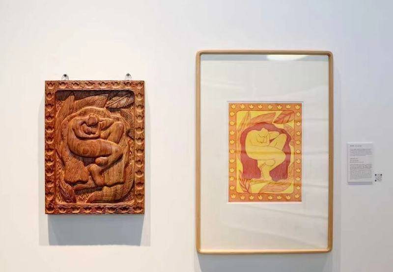 边上,艺术家贺晓琪的作品《流火的七月》意在探索女性和自然的关系,通过榉木雕刻浮雕和锌板抹墨蚀刻画等方式呈现了画面的深度。同样与绘画有关的还有张宇捷的《烛光与花》,这是利用细木镶嵌技法创作的小尺幅作品,展现了一场烛光与静物之间的无声对话。而刘斯婷的岩彩画《缚》通过“我是生而自由的,却又活在无处不在的束缚中”这一主题,探讨了人生的自由与束缚。在转角处,刘凡祎的作品《方寸之间》以窗棂为创作对象,反映了窗与人的关系,以及人文与自然的交融。
