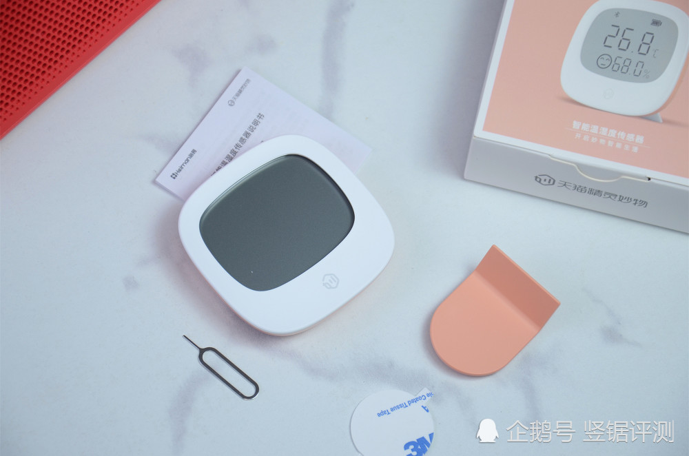 套装内的温湿度传感器并不是一款只能用于监测当前环境温度、湿度的传感器,而是一款可以通过湿度、温度变化来联动其余智能硬件的智能传感器。打开包装后,可以看到除了温湿度传感器外,官方在出厂时还附送了一个用于重置连接的卡针、3M胶贴、桌摆支架以及说明文件。