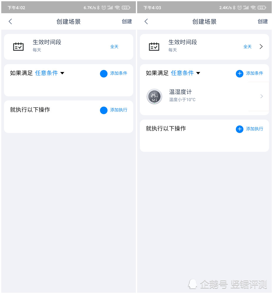 另外,如果家里有天猫精灵音箱的话,还可以设置让音箱每天早上自动播报温湿度的联动。例如:设置时间为每天7点,然后设置温湿度低于多少就让音箱执行自动播报温湿度。
