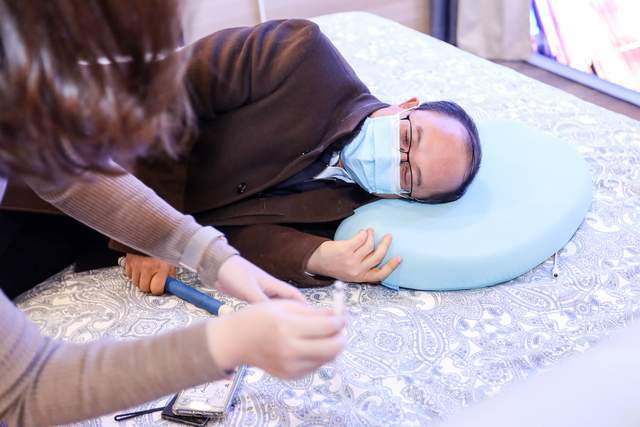 工作人员向视障人士代表中国残联理事、中国盲协主席李庆忠介绍智能深睡枕,这是一款内置了语音芯片的“新物种”,可以直接语音对话,对着枕头轻声喊出“天猫精灵”就能实现交互。根据设定好的睡眠模式,枕头可以播放轻音乐、自行加热助眠,与其他智能家居产品联动后,可以在启动“睡眠模式”下,同时关闭家里的窗帘和照明系统。