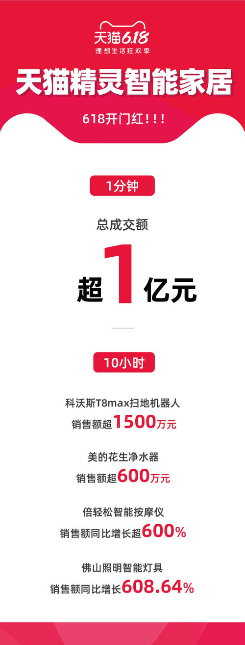 6月1日,天猫618正式开售。仅仅一分钟,天猫精灵智能家居就卖出1个亿,迎来“开门红”!据悉,此次天猫618,天猫精灵与各大家电厂商合作的深度定制智能家居品牌“天猫精灵妙物”共发布了50款新品,截止发稿首发单品销售已破千万;而全平台可以连接天猫精灵的智能家居设备,销售额则在一分钟内突破一个亿。