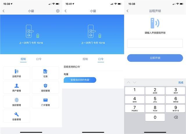 智能锁还能与手机互联进行互动,进入管理界面之后远程开锁操作,了解开锁记录、用户管理以及密码、指纹、门卡管理。还可以为每个开锁方式设置对应的用户名字,方便了解锁记录,家里有老人小孩的相对要实用一些,能及时的了解家人是否到家,好友来访时也可以远程开门。