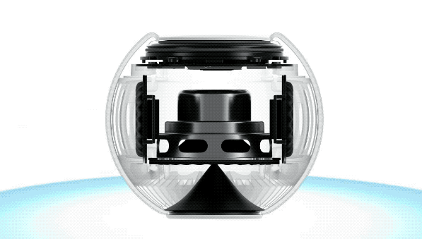 HomePod mini的外观依然延续HomePod的风格,圆滚滚的造型小巧精致。整体覆盖一层透声织物,内部全频驱动单元和双无源辐射器的设计构成的全新的声波导装置,将声音从音箱底部导出,进而实现360°无死角的音频播放,无论在房间的哪个位置,都能收到相同的音效。