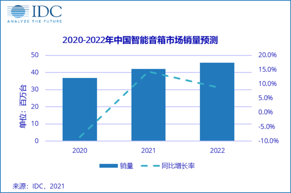 根据《IDC中国智能音箱设备市场月度跟踪报告》显示,2020年智能音箱市场销量3676万台,同比下降8.6%;其中带屏智能音箱占比35.5%,销量同比增长31.0%。2020年中国智能音箱市场竞争格局依旧维持着三强争霸局面,销量共占市场份额超过95%。IDC预计2021年中国智能音箱市场销量将超过4200万台,同比增长14%。