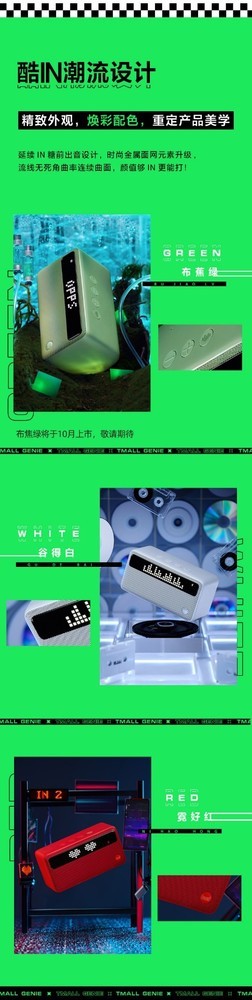 天猫精灵IN糖2拥有独有的精致外观和独特配色,三款产品分别为布蕉绿、谷得白、霓好红,颜色缤纷,全新的时尚金属面网光洁细致,流线型无死角的连续曲面外观使得天猫精灵IN糖2更具质感。机身部分则进行了磨砂处理,使得触摸起来十分舒适。