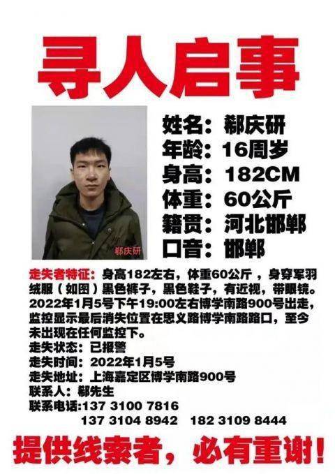 大家好,我来自河北邯郸,我的儿子郗庆研,今年16周岁,就读学校河北省邯郸信息工程学校,12月28日,由老师带领来沪勤工俭学,在嘉定区一家物流企业实习。他原本打算一直实习到年后,过年也不回家。2022年1月5日下午19:00,于嘉定区博学南路900号出走,监控显示最后消失位置在思义路博学南路路口,至今未出现在任何监控下,已经第9天了,没有任何消息。5号晚上曾和妈妈发微信说心情不好,希望父母能接他回家。