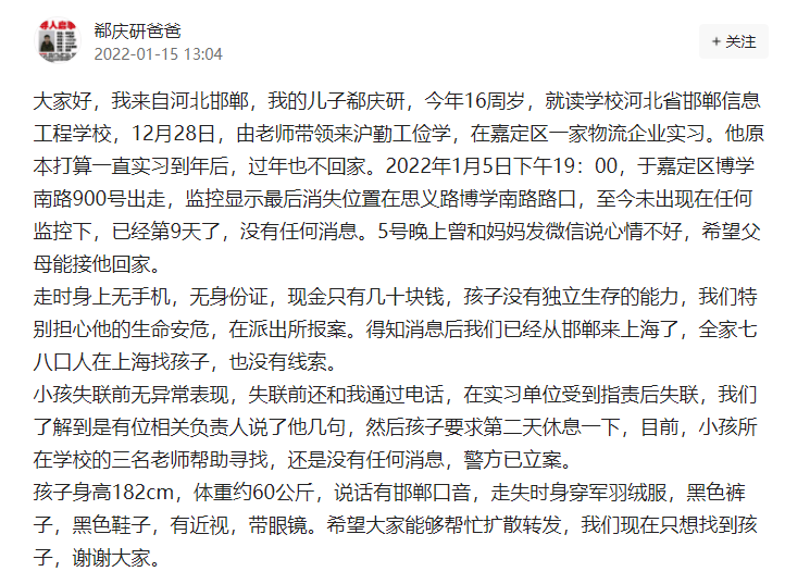 2022年1月15日,“河北中专生上海实习失联”事件当事人家属在社交平台发文,称孩子已经失联9天了,没有任何消息,家里人很担心孩子的安危。