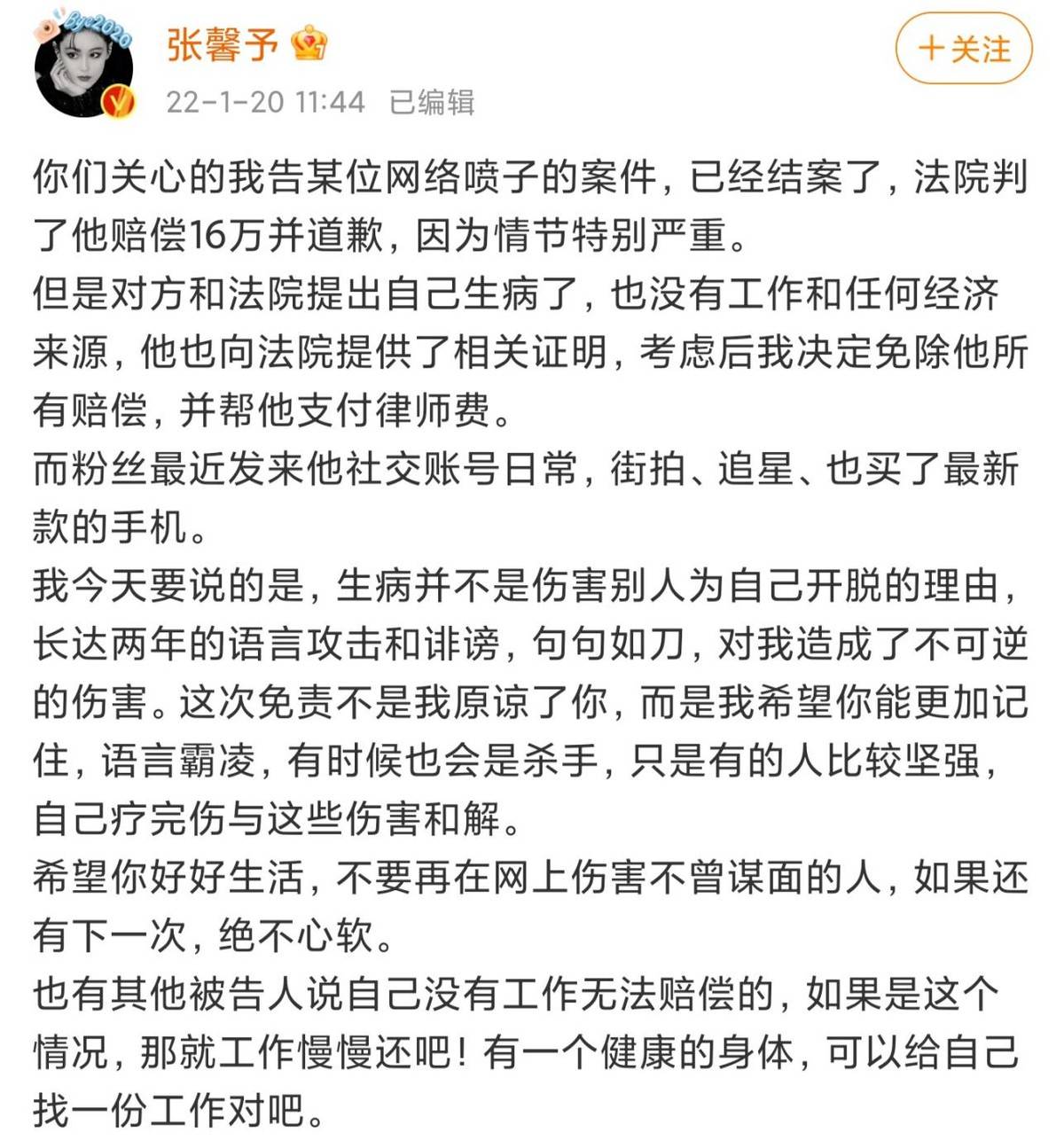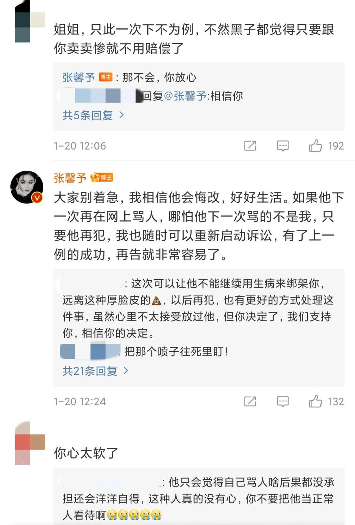 网友看了张馨予的发文,有人吐槽她实在是太心软了,选择原谅只会让对方洋洋得意,不能把黑子当正常人看待。不过张馨予表示相信被告会好好悔改,如果他再有骂人的情况,自己就会选择重新启动诉讼。