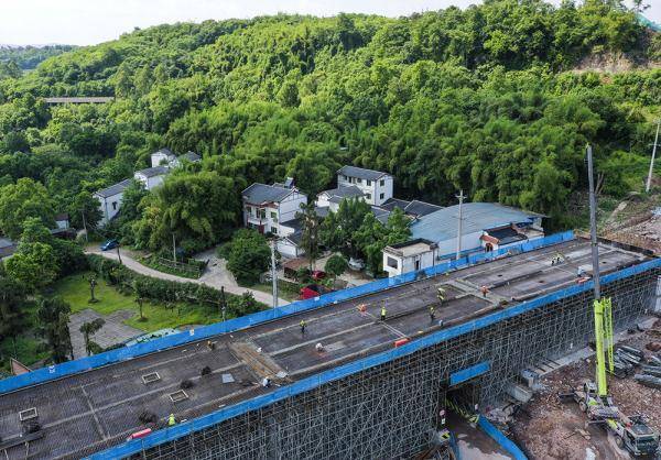 这是5月2日拍摄的重庆科学大道一期工程上盖隧道项目施工作业现场(无人机照片)。新华社记者王全超摄
