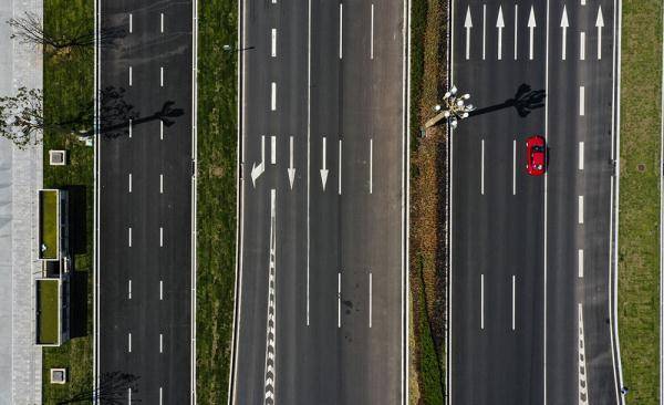 5月2日,车辆行驶在重庆科学大道一期高龙大道至魏家院三公里示范段(无人机照片)。新华社记者王全超摄