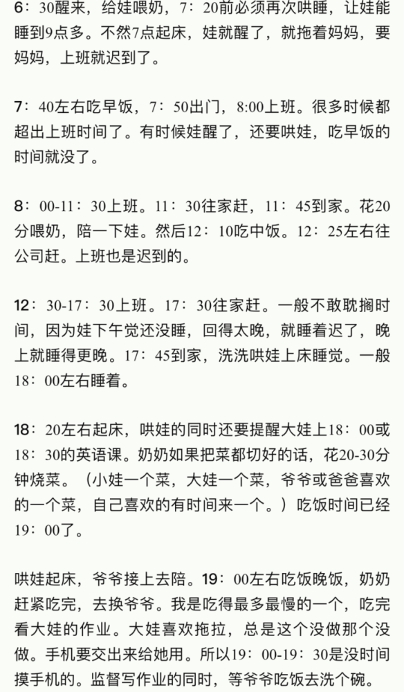 这位妈妈列出了每天详细的时间表,即使有老人在家里帮忙,也是一刻不停地忙碌。