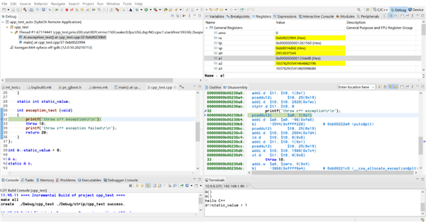 SylixOS内建了C/C++应用程序调试服务器,SylixOS LoongArch体系结构代码实现了获取、设置寄存器的接口、分析当前指令(特别是跳转和分支指令)计算跳转到下一条指令的位置、断点指令的异常处理等功能,开发者们可直接使用RealEvo-IDE提供强大的调试功能进行图形化的应用程序调试: