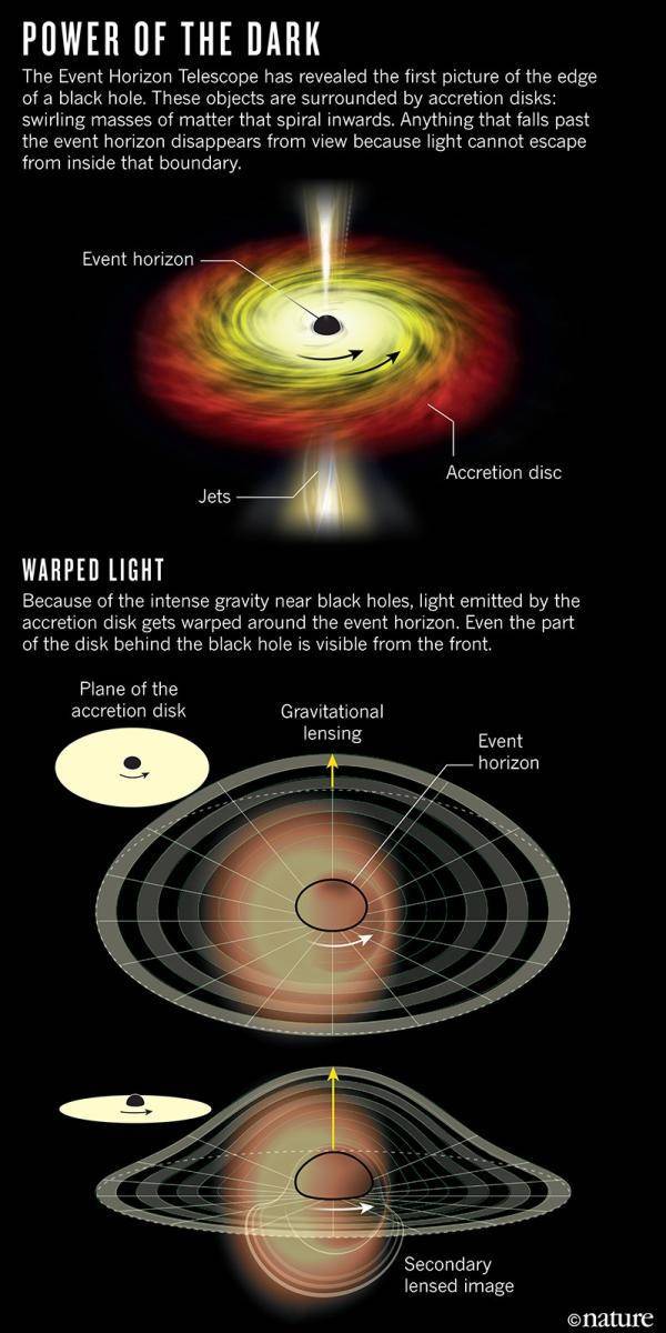 美联社(www.apnews.com)援引参与到该项目天文学家们的描述称,这张图像并没有显示出一个贪婪的宇宙毁灭者,而更像是一个“温和的巨人”,正在近乎忍饥挨饿地节食。图像也证实了爱因斯坦的广义相对论——黑洞的大小正如爱因斯坦方程所规定,大小与水星绕太阳运行的轨道相近。