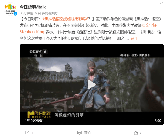 昨日,在CCTV6的《今日影评》节目中,中国传媒大学教师金宇轩与央视主持人蒋小涵共同评析了“黑神话悟空能超越电影吗”这一话题。