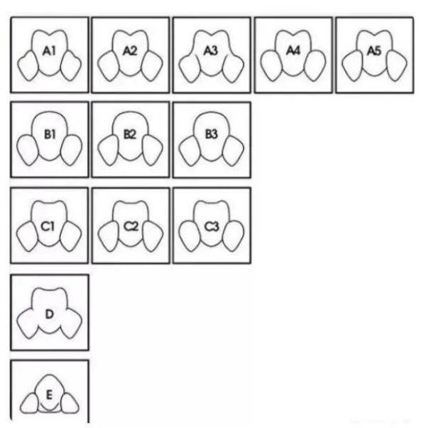 至于爪相与性格的关系,日本一位名叫“暁先生”的手相爱好者曾分析了上千只猫咪前爪肉垫形状,经过大量分析后,他找到了猫咪肉垫与其性格间的关系。他把猫咪的前爪肉垫形状分为五类13种,大致是这样:
