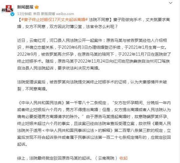 近日,云南红河,河口县人民法院公开一起案件:原告马某与被告罗某经他人介绍相识,并确立恋爱关系,于2020年6月3日办理结婚登记手续,于2021年1月生育一女。2022年9月,被告罗某再次怀孕,在原告马某的陪同下,于2022年11月7日在医院做了终止妊娠手术。随后,原告马某于2022年11月24日向红河哈尼族彝族自治州河口瑶族自治县人民法院起诉,要求依法判决双方离婚。