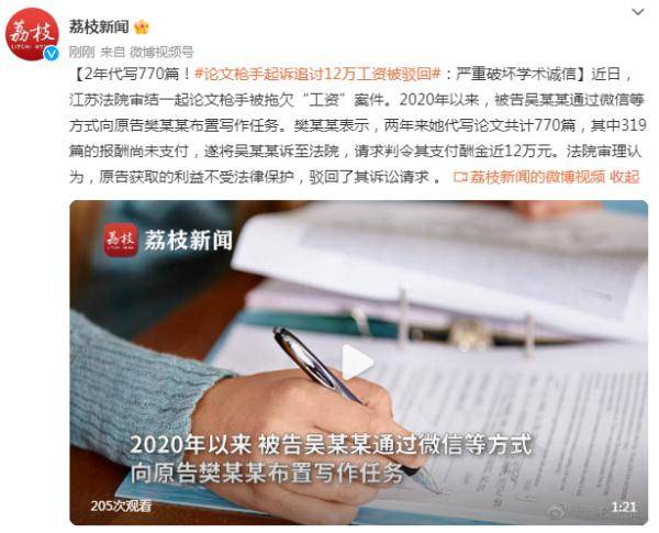 近日,江苏法院审结一起论文枪手被拖欠“工资”案件。2020年以来,被告吴某某通过微信等方式向原告樊某某布置写作任务。樊某某表示,两年来她代写论文共计770篇,其中319篇的报酬尚未支付,遂将吴某某诉至法院,请求判令其支付酬金近12万元。法院审理认为,原告获取的利益不受法律保护,驳回了其诉讼请求。