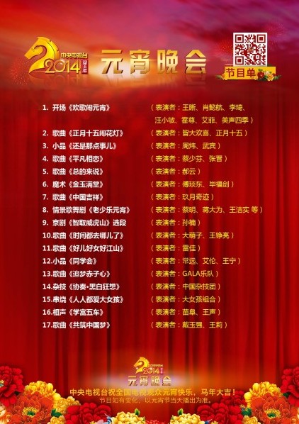 据央视网消息,央视元宵晚会节目单发布,节目单里显示有17个节目,仍以歌曲为主,其中歌曲类节目10个,小品2个,分别为《还是那点事儿》和《同学会》;魔术节目《金玉满堂》将由傅琰东表演,毕福剑将当"托"。